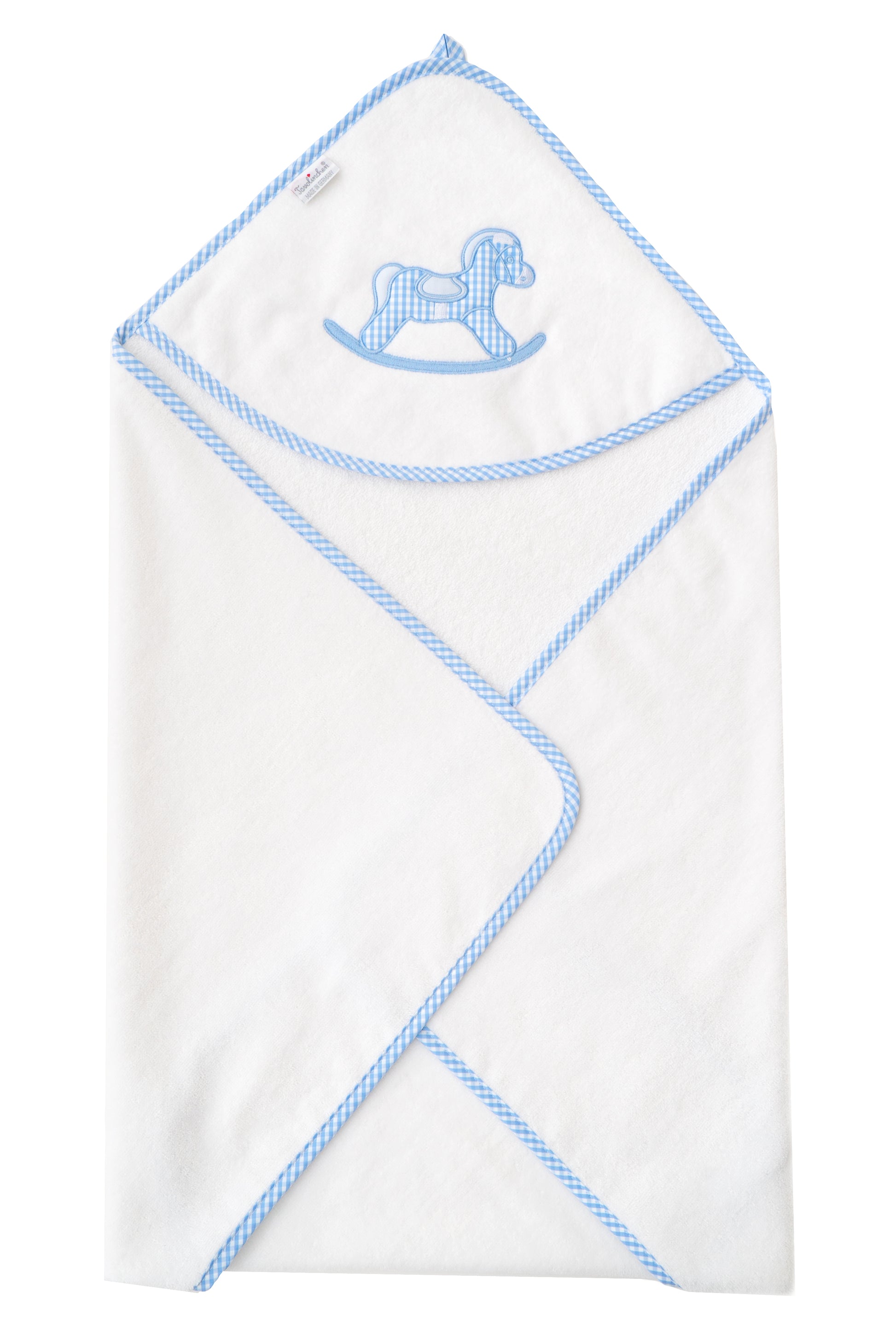 Tavolinchen® Babybademantel „Schaukelpferd“ – weich, hautfreundlich und angenehm auf der zarten Babyhaut. Kapuze wärmt das Köpfchen, Bindegürtel sorgt für einen sicheren Sitz; charmante Schaukelpferd-Applikation mit karierten Details.