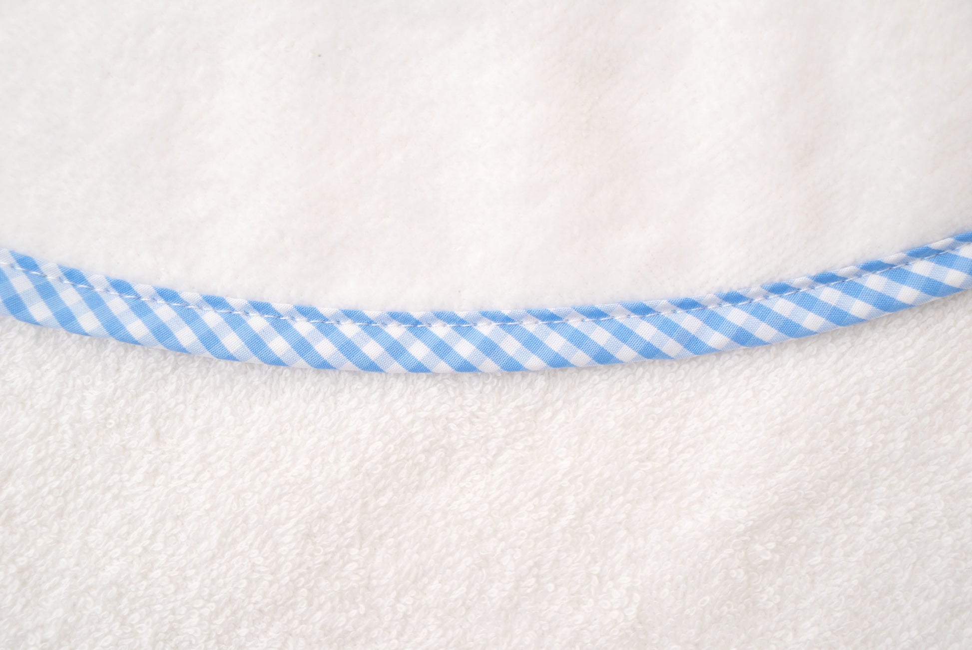 Kapuzenbadetuch „Schaukelpferd“ – außen samtiges Velours, innen saugfähiges Frottier; umlaufende Karo-Einfassung und liebevolle Stickerei. Ideal zum Abtrocknen und Einwickeln nach dem Bad.