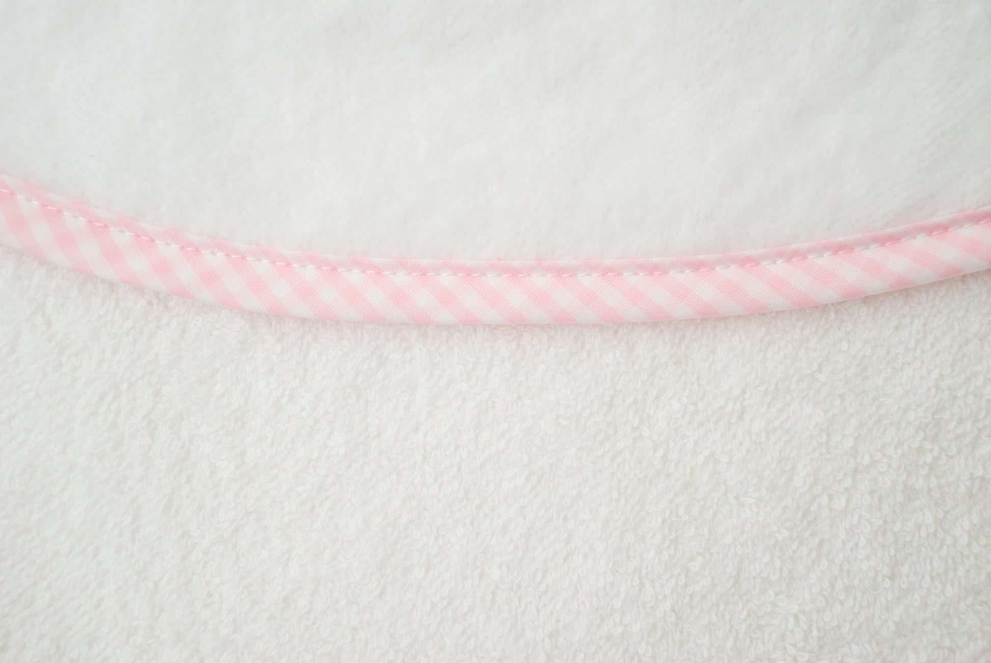 Kapuzenbadetuch: Farben grau, rose oder bleu; Größe 80×80 cm.