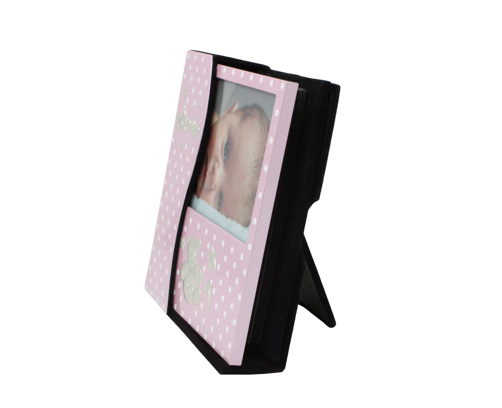 Mit seinem zarten Punktedesign, den sanften Farbtönen in Rosa oder Blau und den feinen, erhabenen Motiven wie Bärchen, Sternen und kleinen Symbolen entsteht ein Album, das Erinnerungen nicht nur bewahrt, sondern sie wunderschön in Szene setzt.