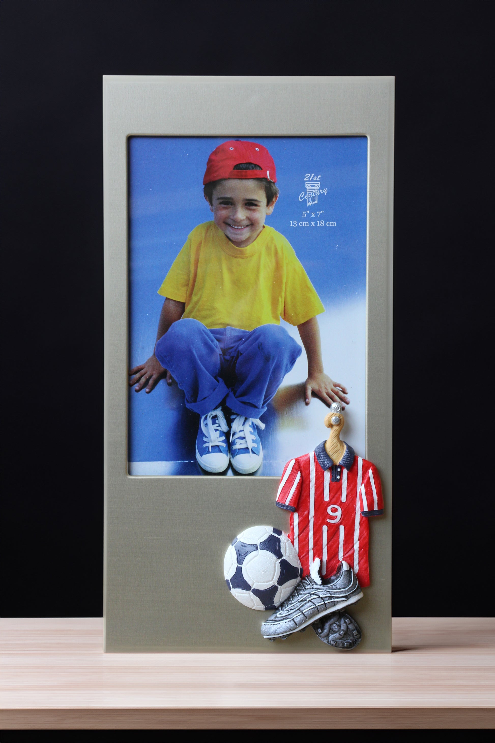 This charming frame offers space for a photo of your grandchild at a game. Decorated with a football, jersey, and shoes, this frame is not only a practical way to store memories but also a stylish decorative piece for any home.