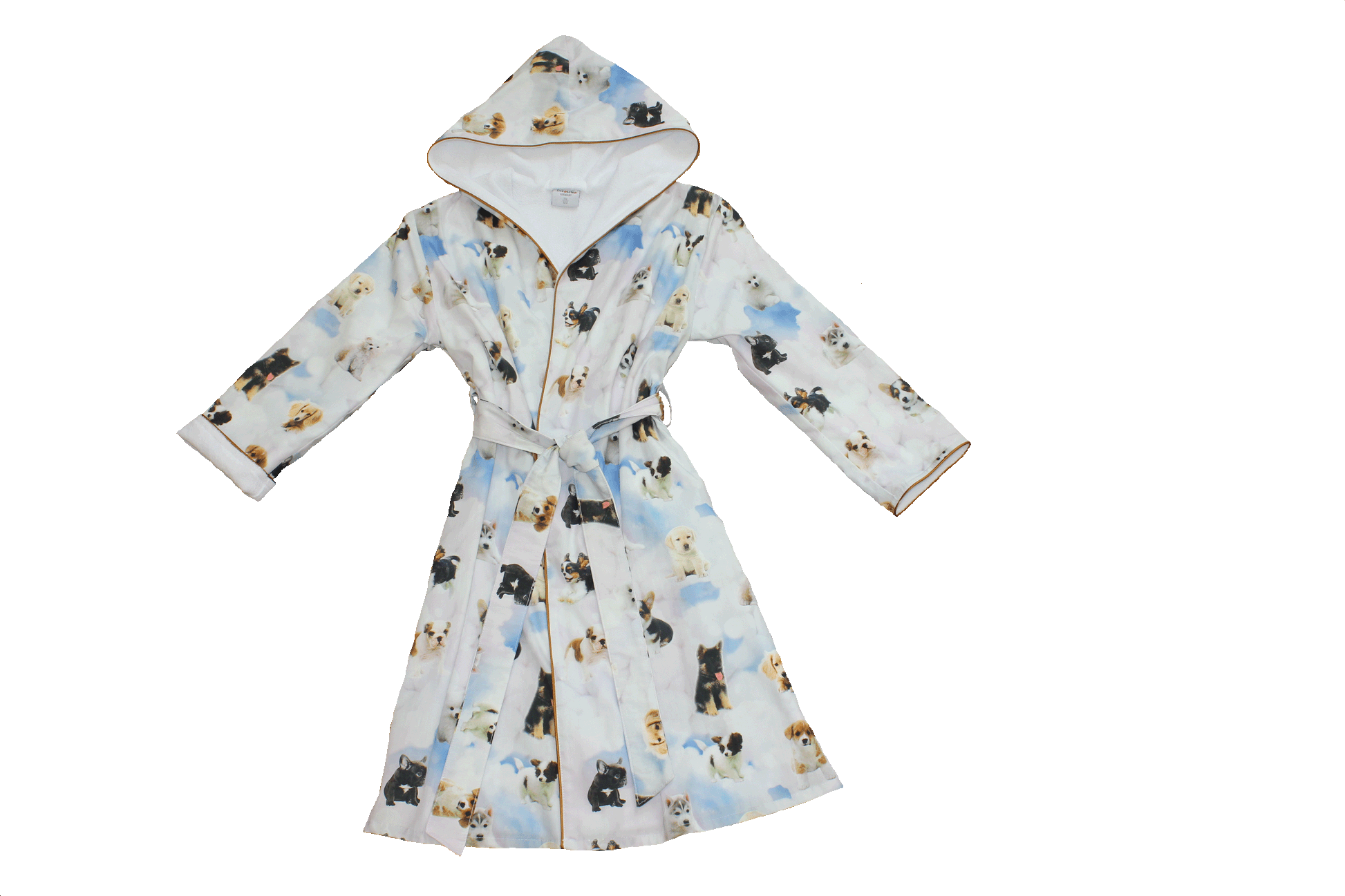The Tavolinchen double-face bathrobe "Little Puppy Friends" brings joy and coziness to any child's room. Lovingly designed puppies on soft clouds make this bathrobe a favorite for little animal lovers.