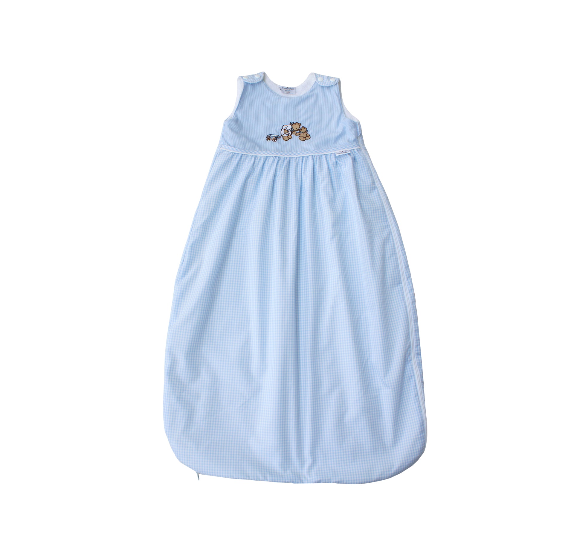 The "Bear Trip" terry cloth sleeping bag brings warmth and charm to any child's room. The enchanting embroidery featuring two little bears and a stroller tells a loving story of security and friendship. The classic check pattern gives the sleeping bag a timeless look, while the cozy terry cloth lining ensures cozy warmth at night. Shoulder buttons and a side zipper make it easy to put on and take off. Ideal for restful nights and sweet dreams.