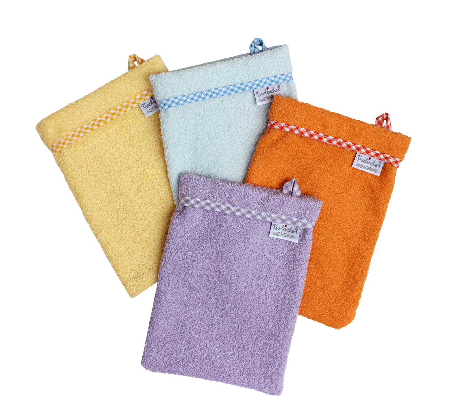 The terry cloth wash gloves are supplied as a set of four in the delicate colours purple, blue, orange and yellow – for colourful, soothing care that brings joy.