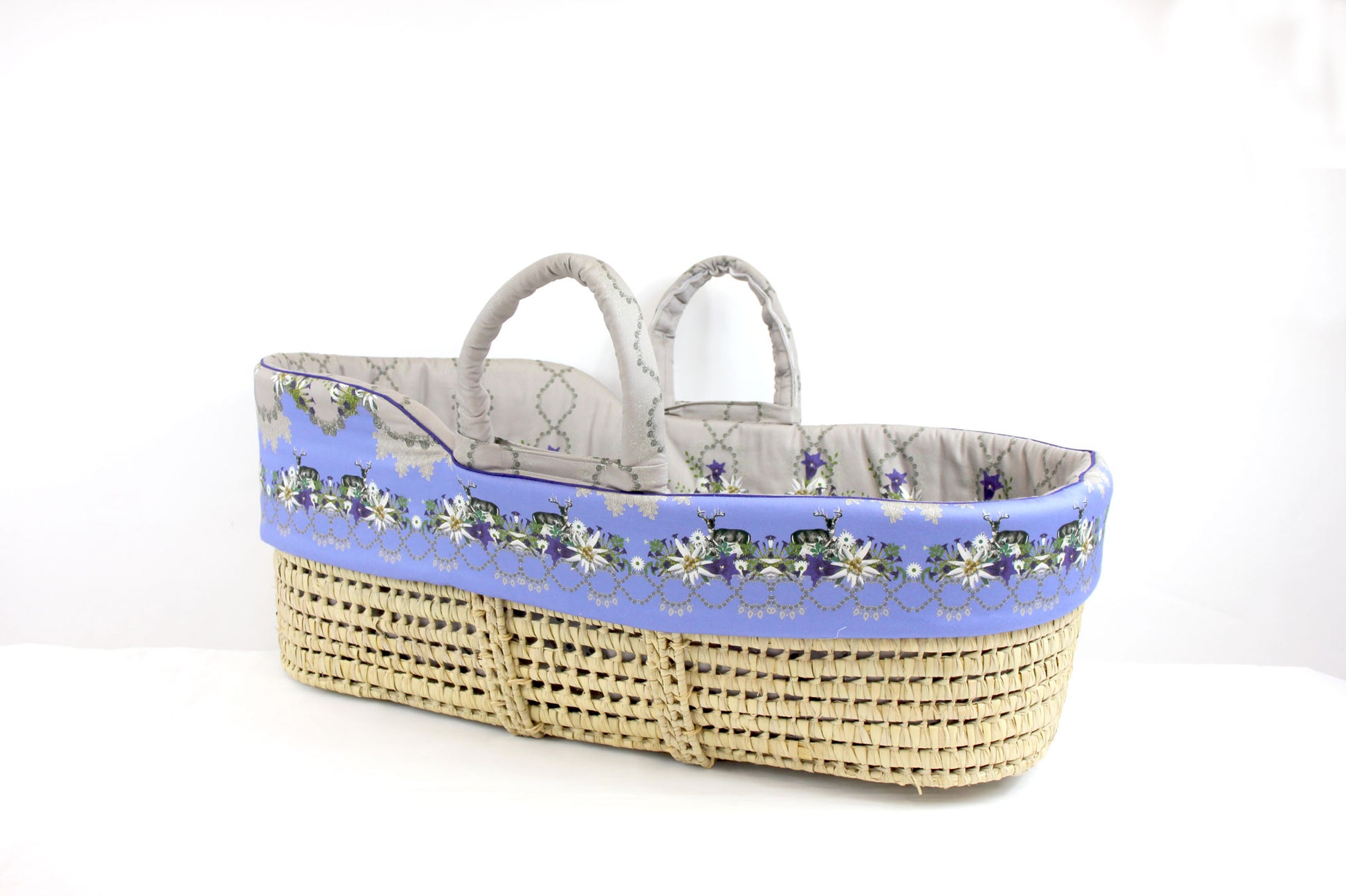 The Moses basket features a unique design that combines alpine elegance with floral edelweiss blossoms and stylish deer motifs. The soft purple fabric, decorated with traditional patterns, lends the basket a unique, natural charm. The elegant gray lining and the charming ornaments complete the harmonious design.