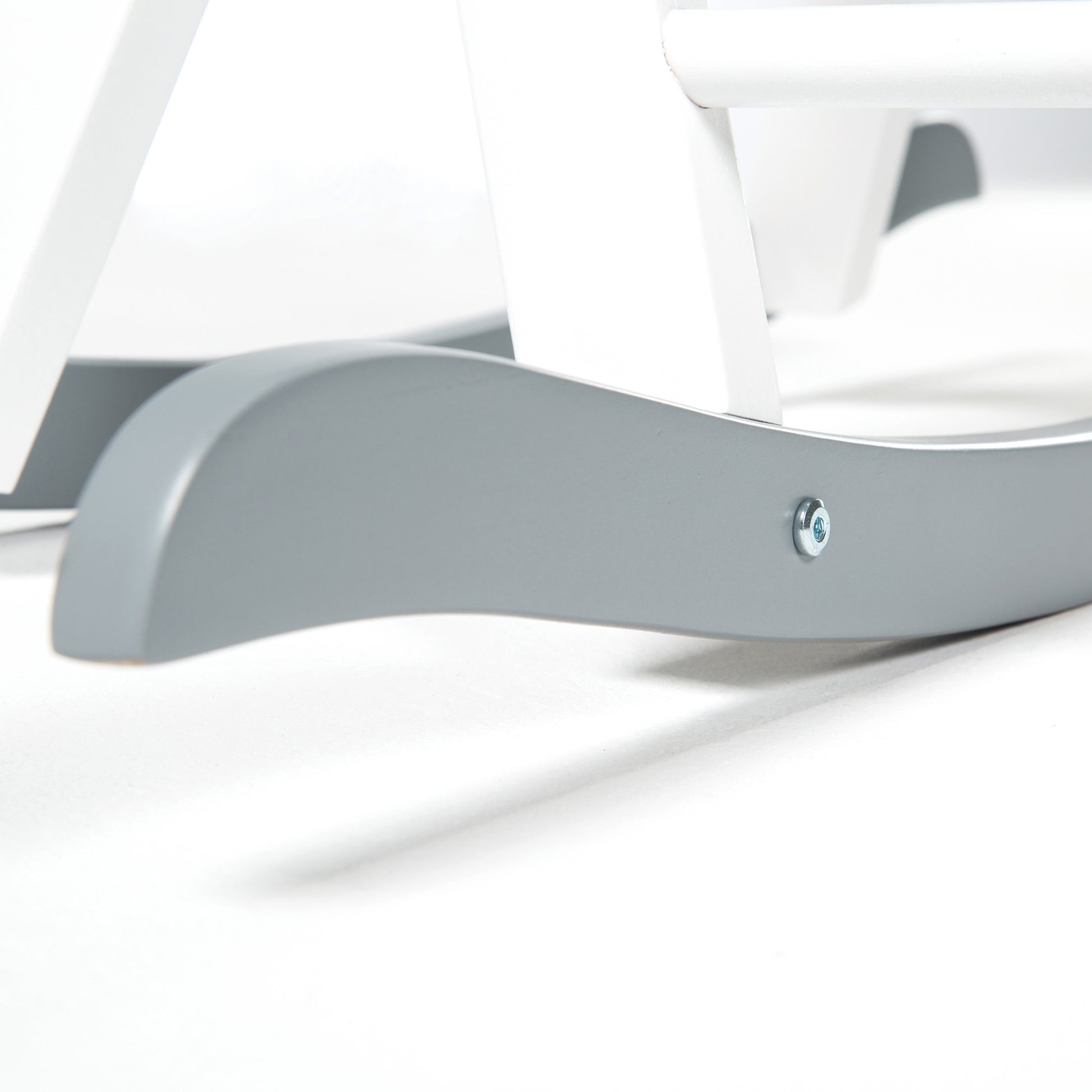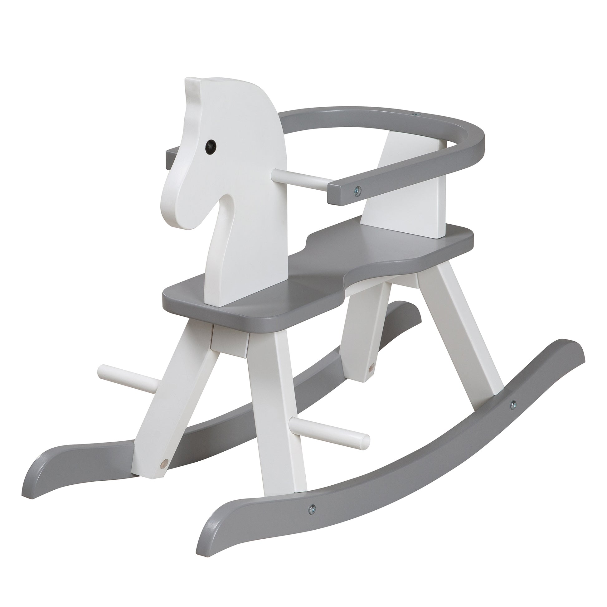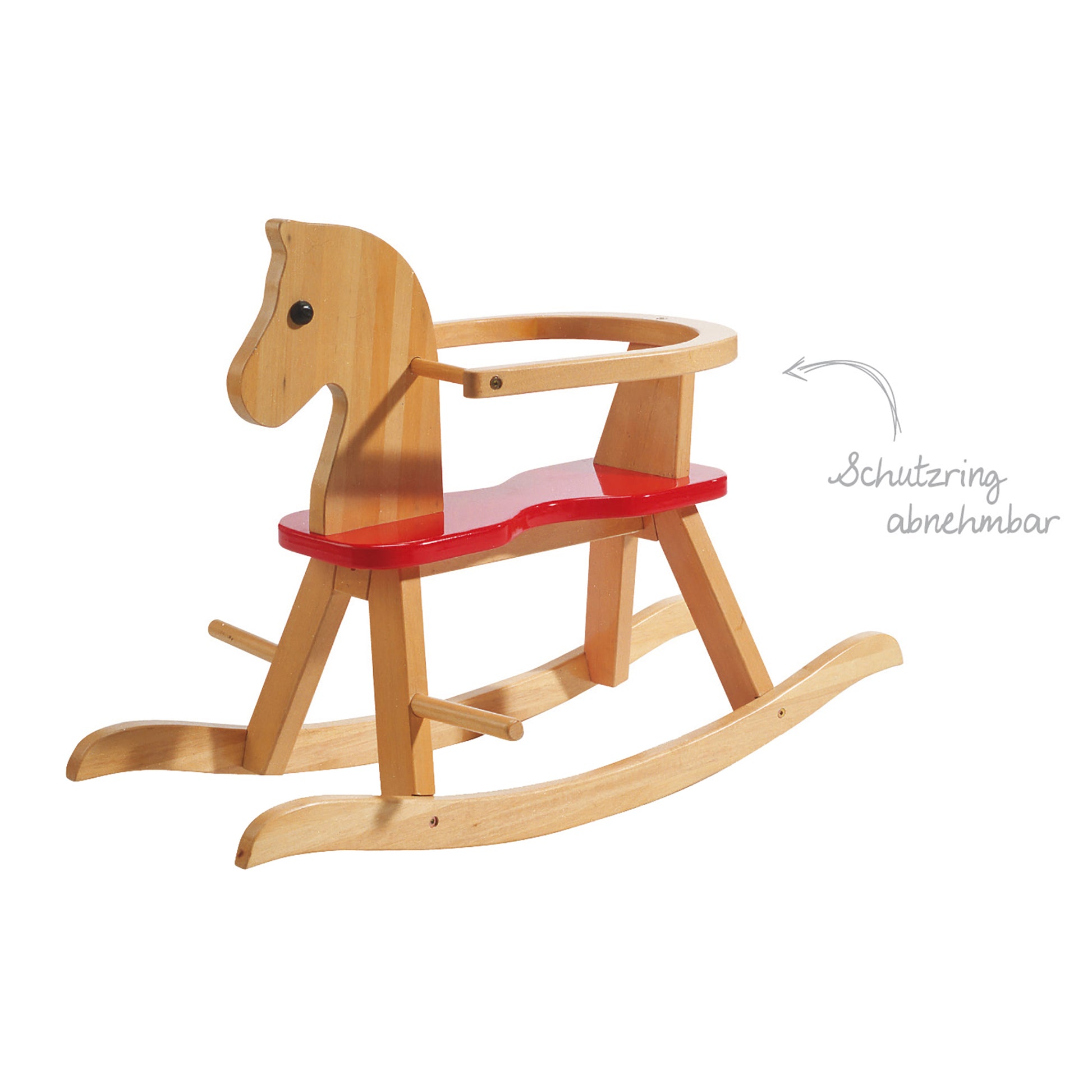 Das Schaukelpferd mit Schaukelstuhl sowie Rücken- und Armlehnen wächst dank des abnehmbaren Schutzrings mit. Wird das Kind größer und kann bereits selbstständig sitzen, entfernt man einfach den Schutzbügel.