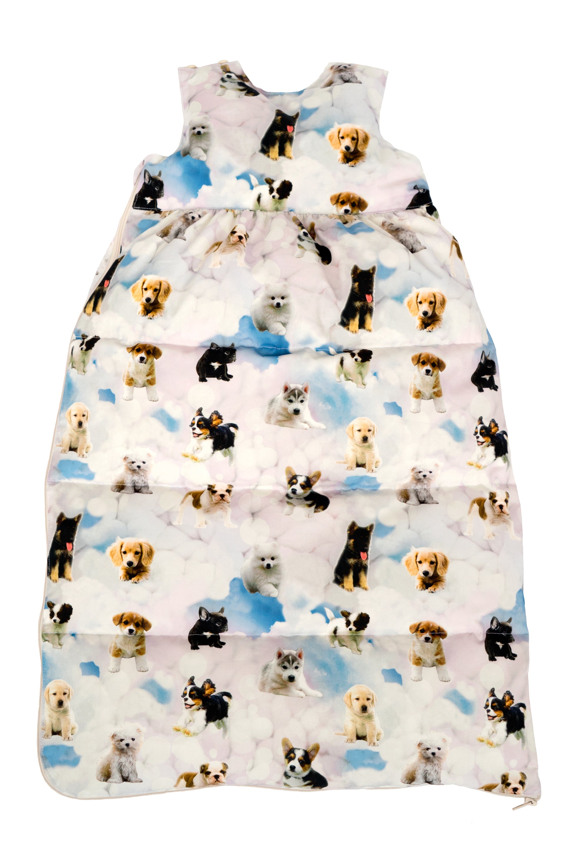 The Tavolinchen "Little Puppy Friends" down sleeping bag brings joy and comfort to any nursery. Lovingly designed puppies on soft clouds will keep your baby safe throughout the night, making this sleeping bag a true favorite.