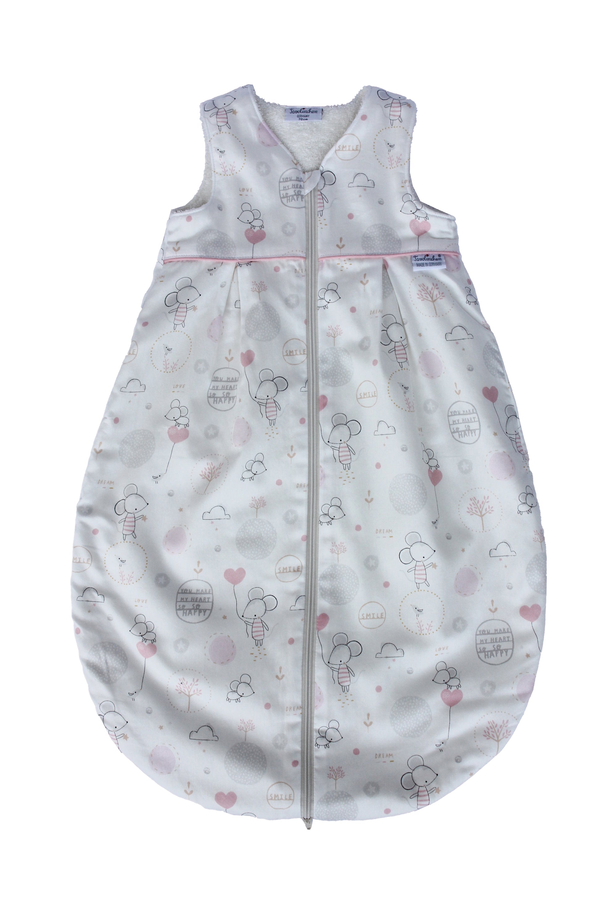 A playful terry cloth sleeping bag with little mice from the sleeping bag expert TAVO for your little darling.