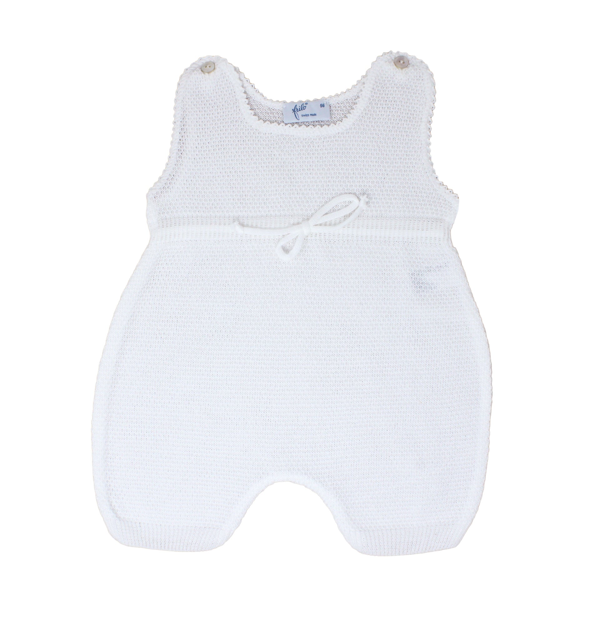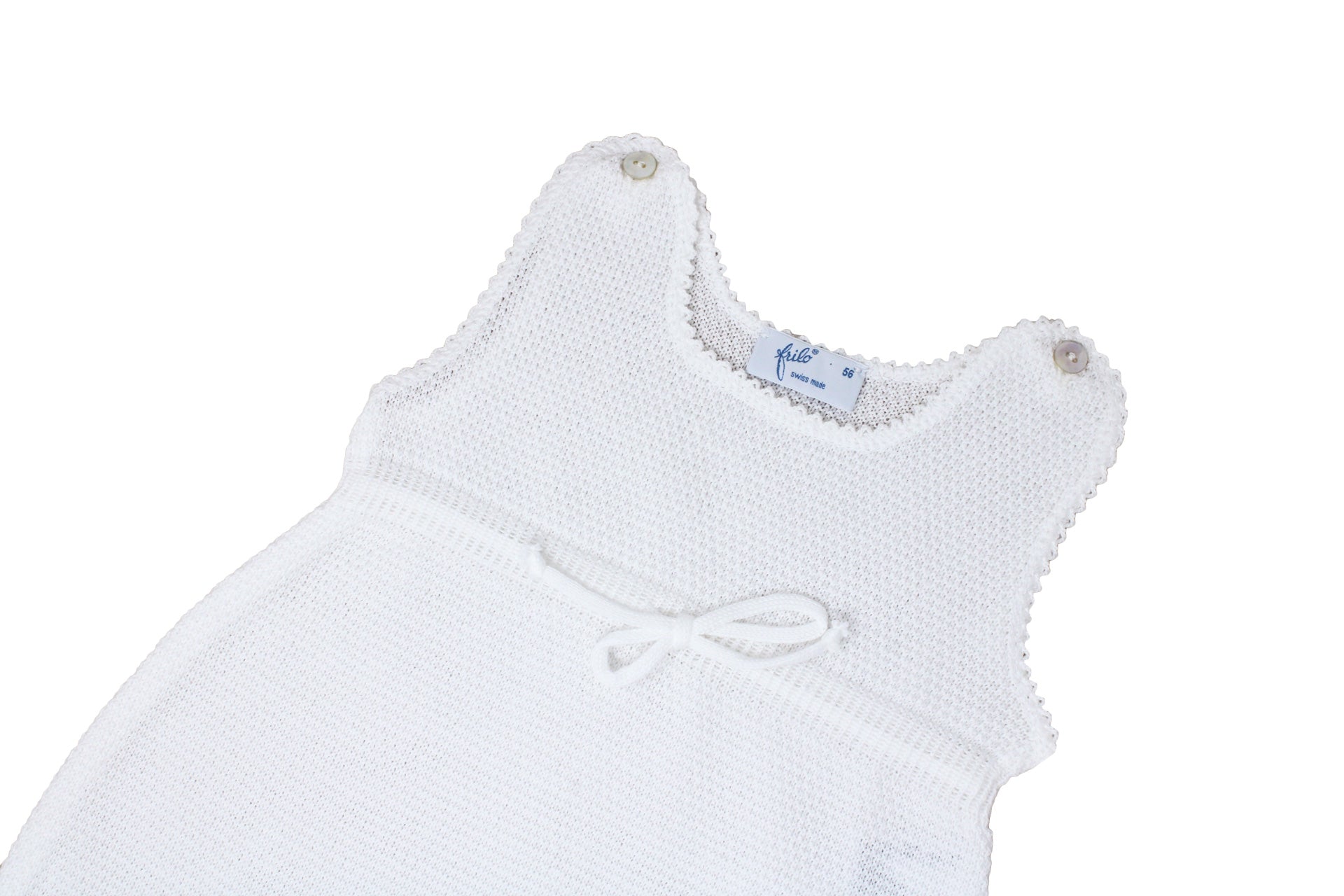 Durch den ärmellosen Schnitt und die kurzen Beine bietet der Strickstrampler viel Bewegungsfreiheit, während die sorgfältige Verarbeitung und die dezenten Knöpfe im Schulterbereich das An- und Ausziehen erleichtern. Die feine Strickstruktur und die klare Linienführung unterstreichen den zeitlosen Charakter dieses hochwertigen Kleidungsstücks.