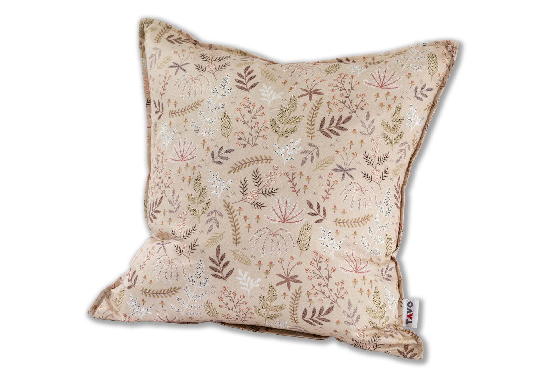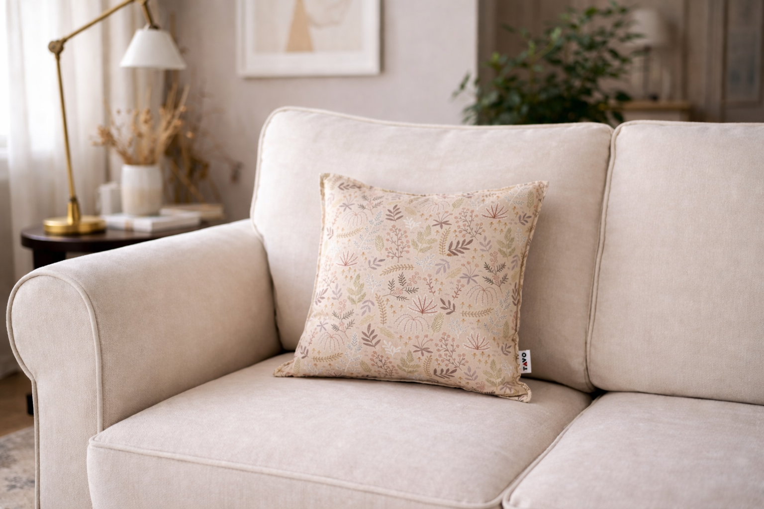 Dieses Kissen bringt Ruhe, Wärme und natürliche Eleganz in jeden Raum. Das feine Interieur-Muster mit zarten Blättern und floralen Elementen wirkt harmonisch und ausgewogen – genau das Richtige für eine gemütliche Atmosphäre im Kinderzimmer, Wohnzimmer oder Schlafzimmer.